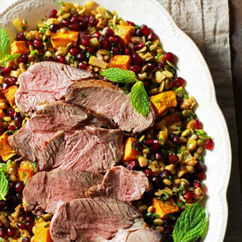 Meanwhile, cook freekeh in a pot of salted boiling water for 20 minutes until tender, drain and set aside to cool slightly. Transfer freekeh to a bowl along with shallots, olives, pomegranate, mint, pumpkin, pumpkin seeds and walnuts and toss to combine. In a small bowl, whisk all ingredients together for the dressing, season with pepper, pour over salad and transfer to serving plate.