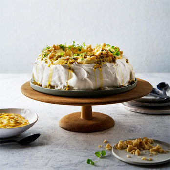 Place pavlova onto a serving dish. Gently fold the passionfruit curd through cream to form a marbled effect.