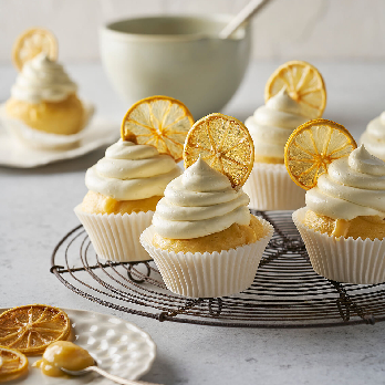 Pipe or spoon the buttercream over the top of each cake. Garnish with candied lemon wheel.