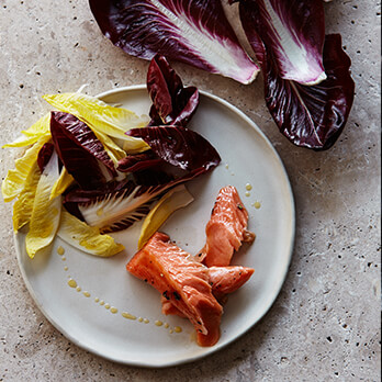 Break up the treviso and witlof leaves and place a few leaves on each plate then season and drizzle with the olive oil and a few drops of lemon juice. Carefully tear up the trout into large pieces and serve.