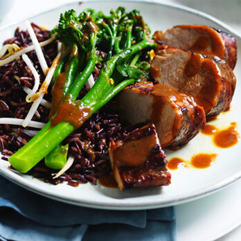 - Divide the black rice between plates, top with a handful of bean sprouts. Slice the pork, place onto plates with greens. Drizzle with the miso sauce and serve.