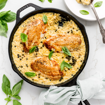 4. Whisk together the cream, mustard, egg yolk and stir into the frypan with the green peppercorns. Return the chicken to the pan, skin-side up. Transfer to oven on the middle shelf and bake, uncovered, for 10 minutes, or until the chicken and orzo are cooked through.