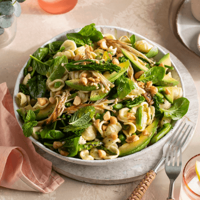 - Cook orecchiette according to packet instructions. Drain and place in a large bowl; stir through half of the dressing and the baby spinach; toss to combine.