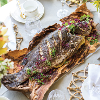4. Rub each side of the fish with olive oil, lemon myrtle and season to taste with salt and pepper. Place the fish onto the bed of paperbark and stuff the cavity with spring onions, ginger and sliced lemon before wrapping up in paperbark and securing with foil or kitchen string. Ensure the fish is completely encased to lock in all flavours and moisture.