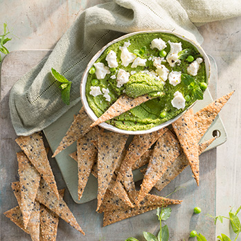 7. Transfer the puree to a serving bowl or spread on a shallow plate. Crumble the feta or goat’s cheese over and drizzle with a little more olive oil. Serve with the Sesame & Parmesan Crackers.