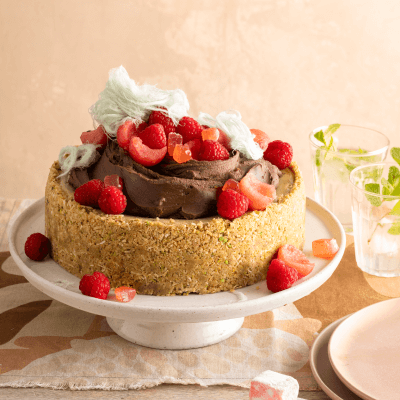 - To serve, whip the chilled ganache for 2 minutes, or until it lightens in colour and texture. Release the cake from the pan and place on a serving plate. Spoon over the whipped ganache and decorate with raspberries, watermelon, Turkish delight and fairy floss.