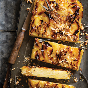 7. Turn potato gratin onto a chopping board and cut into 8 slices. Place on a roasting tray lined with baking paper. Set oven to 220°C on reheat/regenerate function for 15 minutes. Garnish with sage, hazelnuts, and sea salt.