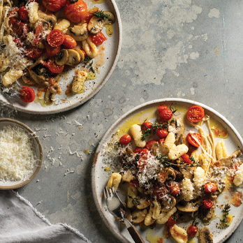 8. Divide gnocchi between serving bowls, top with tomatoes, remaining grated parmesan, and fresh thyme leaves. Serve immediately.