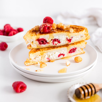 7. Slice French toast in half diagonally and serve topped with reserved raspberries, honey macadamias and an extra drizzle of honey.