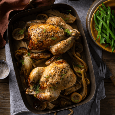 - To prepare the chickens, stuff a few of the lemon slices into the cavity of each chicken. Place remaining lemon slices and garlic cloves in the roasting pan; pour over the chicken stock and white balsamic. Place chickens on top of the prepared vegetables; drizzle with extra olive oil. Season well with salt and pepper, sprinkle with fennel seeds and scatter with the reserved fronds.