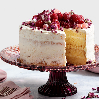 Decorate top of the sponge cake with raspberries, Turkish delight and rose petals.