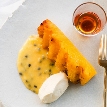 Cut each pineapple into 6 length pieces, remove the cores and sous vide with the caramel on 25°C. Pineapple pieces should be 120g before roasting.
