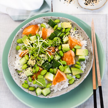 - Make the dressing by combining all the ingredients in a small bowl and whisking to combine. Divide rice among 4 serving bowls. Top with salmon, avocado, edamame and cucumber. Garnish with pea shoots and sprinkle with sesame seeds. Serve drizzled with dressing.