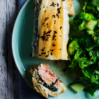 - Place a single sheet of filo onto a clean work surface and brush the edges lightly with extra virgin olive oil. Lay a second sheet over the top and again brush the edges with the oil. Then place a salmon fillet at one end and top with a quarter of the spinach cheese mixture. Wrap up the filo parcel to encase the salmon. Place onto the prepared baking tray and repeat with remaining filo, salmon and spinach mixture to make three more parcels.