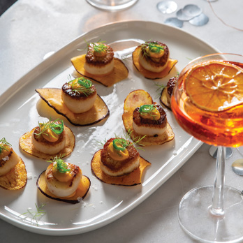 6. Place sweet potato chips on a serving plate; spoon 1/2 teaspoon of carrot puree over chips then top with a scallop; spoon one teaspoon of carrot puree over scallop; divide wakame over the top of each scallop.