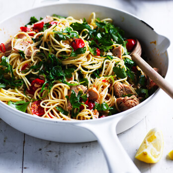- Heat a frying pan over medium heat. Add the olive oil and sauté the onion, garlic and chilli 2-3 minutes until softened. Add the tomatoes, capers, lemon rind and tuna. Cook staking the pan for 1-2 minutes until warmed through, taking care to leave chunks of tuna.
