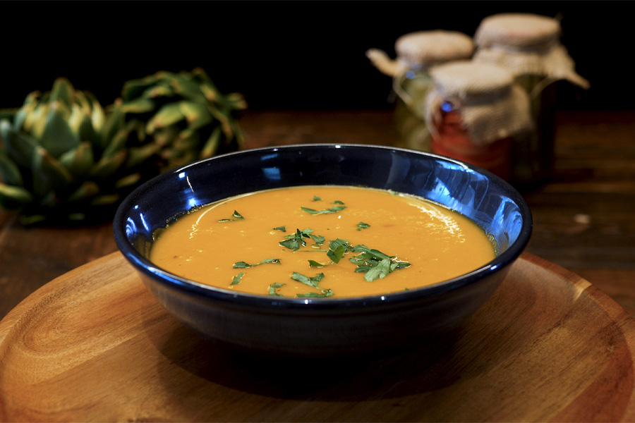 Toss pumpkin, carrot, onions and garlic in olive oil, salt and pepper and roast at 190 degrees celsius for 40 mins or until caramelised and soft.