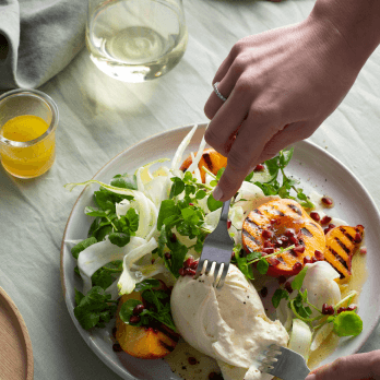 - To serve, place burrata and peaches onto a large serving platter; place watercress and fennel in a bowl and gently toss with orange dressing; place onto platter and garnish with pomegranate seeds.
