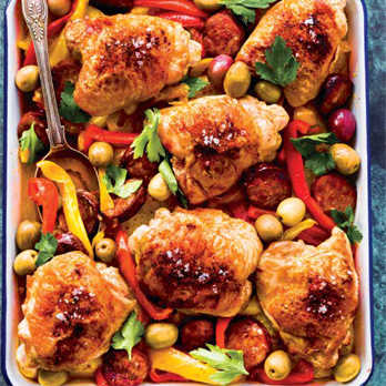 Place chicken thighs over the top, skin-side-up and drizzle with oil.