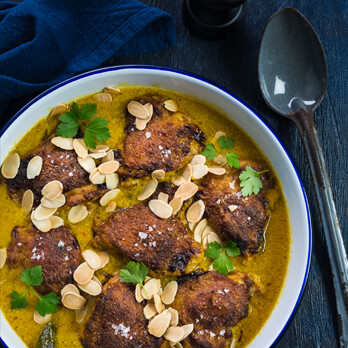 - Transfer to oven and cook, covered, for 30 minutes, then uncovered for a further 30 minutes. Season to taste with salt and pepper. Serve chicken topped with toasted flaked almonds and parsley leaves.