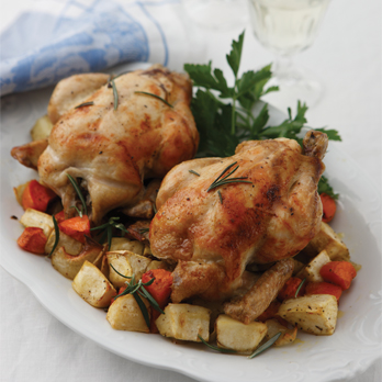 Slide spatchcock from rod and serve on top of the vegetables with rosemary to finish.
