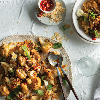 3. In a medium bowl, gently combine cauliflower, fetta, mint, and chilli. Season with salt and pepper and sprinkle with sultanas, flaked almonds, and extra mint leaves.