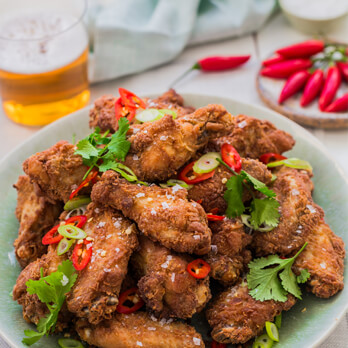 - Half fill a large saucepan with oil to 160°C. Working in batches, fry the wings for 7-8 minutes until golden brown and cooked through. Drain on paper towel and transfer to serving dish. Sprinkle wings with sliced chilli, spring onion and coriander. Serve.