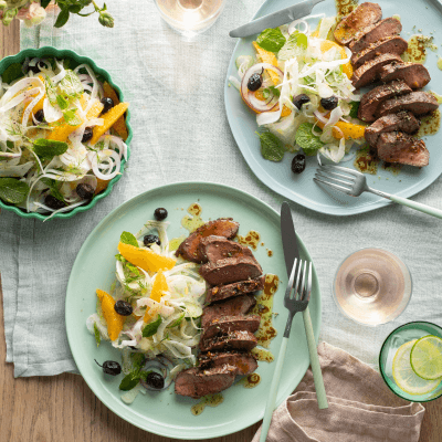 - Meanwhile, prepare the Orange, Fennel and Olive salad by combining orange segments, fennel, olives and onions. Set aside.