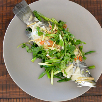 Place the fish on top of the aromatics and cover the top of the fish with the remaining aromatics and a drizzle of the garlic oil.