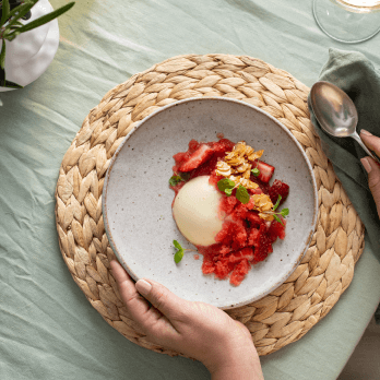 - Pour half of the strawberry mixture into a small bowl and stir through chia seeds, place in the fridge to set. For the granita, mix the remaining strawberry mixture with kombucha and pour into a lamington tray. Place in the blast chiller for 1 hour or until set. Using a fork, scrape the surface until flakes appear; return the flakes to the freezer until you’re ready to serve.