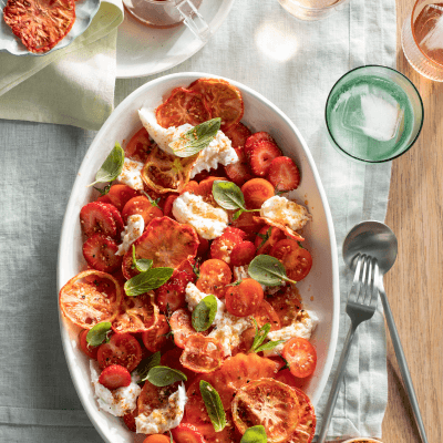 - Assemble salad by layering the different fresh tomatoes, strawberries, mint, basil and mozzarella; drizzle with dressing. Sprinkle with shichimi togarashi if using and top dehydrated tomato slices.