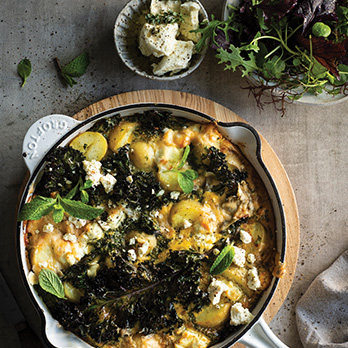 - Cut potatoes into even pieces. Arrange evenly in pan and spread kale mixture over potatoes. Scatter half of the goat’s cheese over vegetables, then pour in egg mixture. Top with remaining goat’s cheese and parmesan.