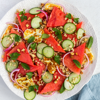 To assemble, arrange half the cooled pearl barley on your serving dish, followed by the watermelon, cucumber, haloumi and remaining pearl barley. Drizzle over dressing, top with reserved onion, mint, parsley and almonds.