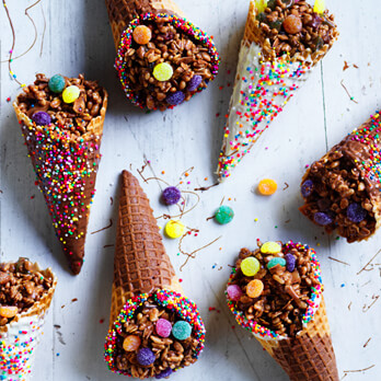 - Add the rice bubbles, muesli, coconut and sweets and mix well. Working quickly, spoon (½ cup per waffle cone) the mixture into the waffle cones to fll. Top with jelly tots. Stand upright in tall glasses to all to set.