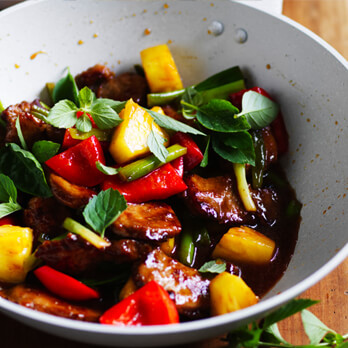 - Add the capsicum, green onions and pineapple to the hot wok. Stir fry 1 minute. Return the pork to the wok and pour over the sauce. Toss to coat. Scatter over basil if using. Serve with rice.