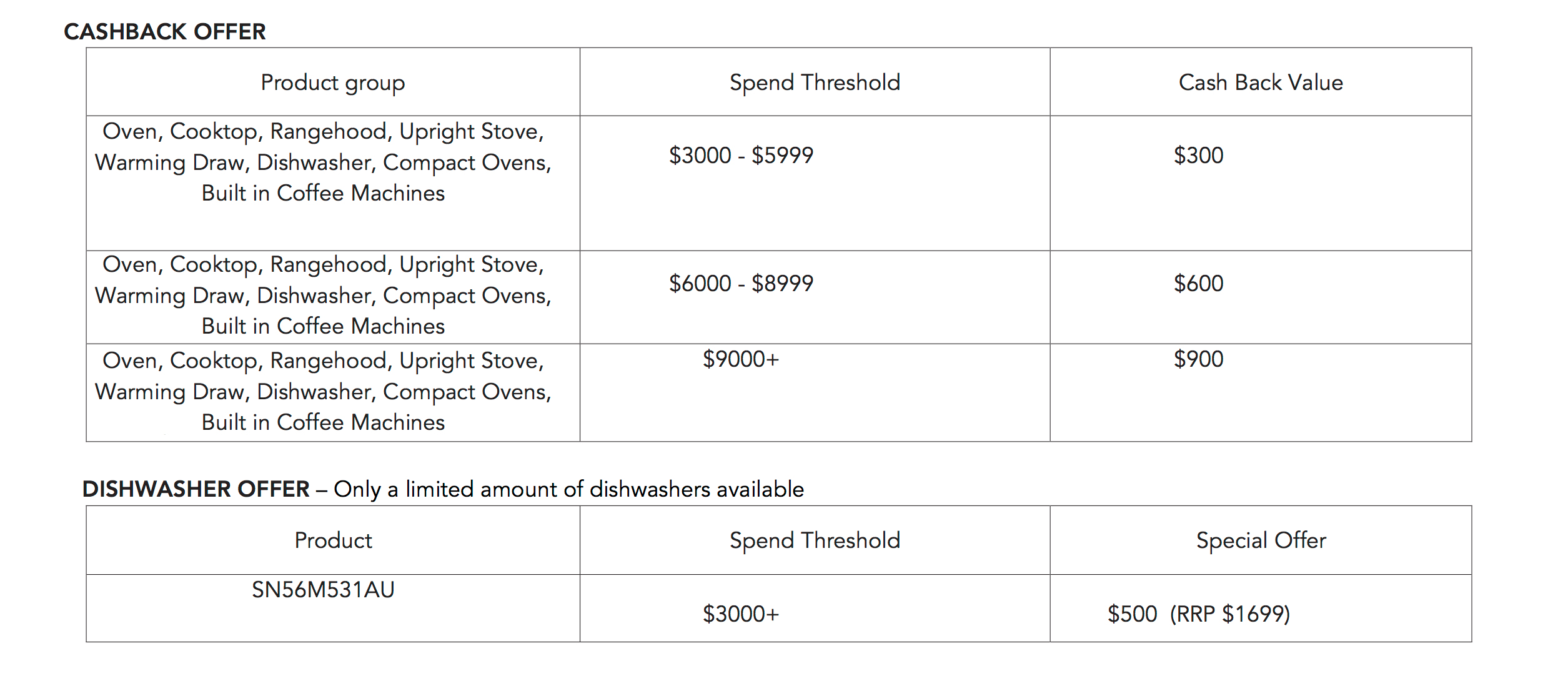 6. Eligible product groups and cashback amounts are detailed below: